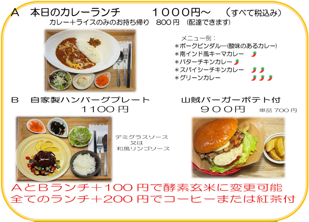 コーヒーまたは紅茶付:+200円大盛り(250g) 価格:+100円 酵素玄米に変更価格:+100円 |
